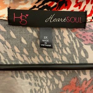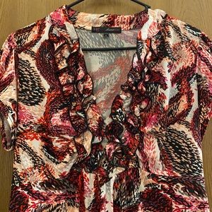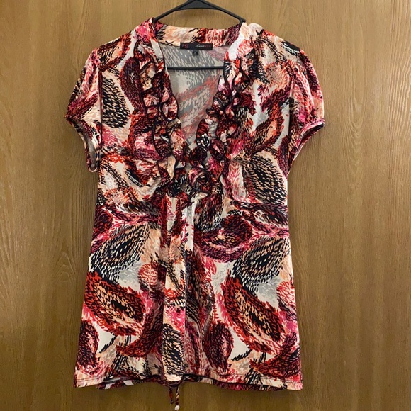Pink, red, black and white paisley style pattern. Has a tie on the back. Has ruffles on the front. Love this shirt, sadly it no longer fits. Excellent used condition, only worn a couple times.
