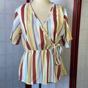 Multicolored retro vibe striped top with faux wrap on the chest, tie around the waist, as well as elastic on the waist. There is a button on the V-Neck of the chest, with cutouts along the V-neck. This top is so pretty, and in amazing condition!