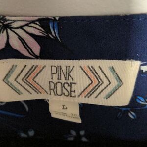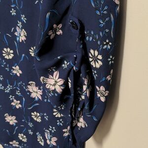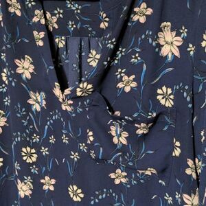 Navy v neck blouse with pink and white floral print. Sleeves are three quarter sleeves with roll tab. Cute pocket on front.