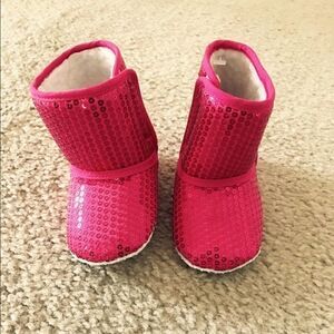 Pink Sequined Boots Size 2. These boots are so much fun and sparkle with pink sequins. They have never been worn. They are thinner material but lined really well inside. I could not locate a tag inside them but they appear to be a size 2 compared to other size 2 shoes. All items $6 and under must be bundled!