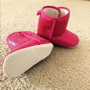 Pink Sequined Boots Size 2. These boots are so much fun and sparkle with pink sequins. They have never been worn. They are thinner material but lined really well inside. I could not locate a tag inside them but they appear to be a size 2 compared to other size 2 shoes. All items $6 and under must be bundled!