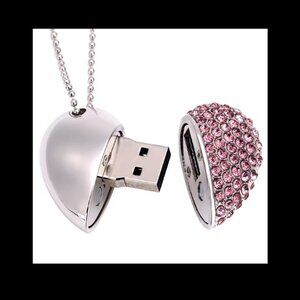 128GB Flash drive pendant. Silver/Pink heart shape with small chain. Pc/Mac compatible. Pendant size is roughly 1.5"x1.5" inches.