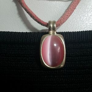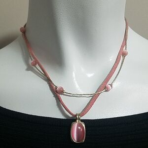 Pink and silver colored catseye necklace. Length is 17.5 inches.