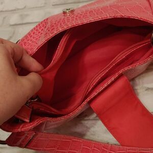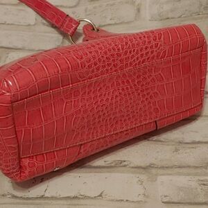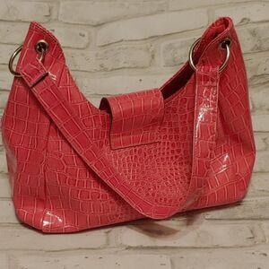Pink shoulder bag purse with magnetic snap closure. Snake or Alligator type skin pattern. Very roomy and comfortable to carry. Big middle zipper pocket with smaller zipper pocket inside. Excellent condition, smoke-free home. More vibrant pink than pictures show.