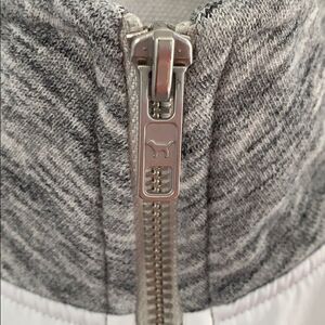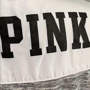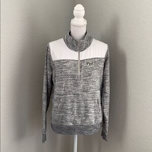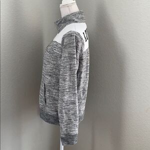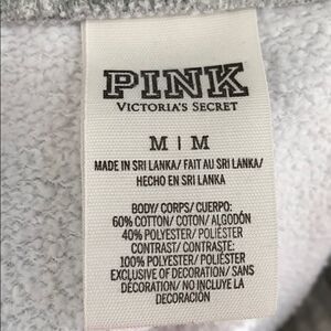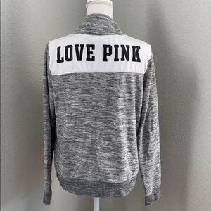 Pink Victoria’s Secret Pullover. Lightweight sweater. 1/4 zip. Long sleeves. Heather gray in color. Love Pink written on the back. The Love Pink letters are a bit faded. Tried to take a picture of them up close. Kangaroo pocket in front. Underarm measurement laying flat is 21 1/2 inches. Size M.