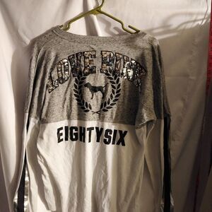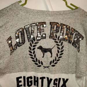 Ling sleeve sequined love pink dog tee with stripes down the sleeves. Chest 21". U