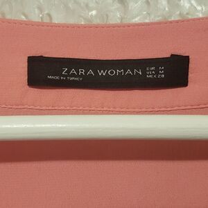 Beautiful thin pink long sleeve tunic size medium the material contents tag has been removed but feels like a poly blend softer and flowy very breathable. Higher front than back as seen in pictures can be dressed up or dressed down with some jeans or capris