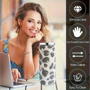 This NWOT Pink/White Sparkling Cow Print 20oz Stainless Steel Tumbler Insulated Reusable, Hand-Wash Only Water Bottle w/Lid & Straw Insulated BPA-Free Water Bottles with Lid & Stylish Chain Strap is in EXCELLENT CONDITION, no snags; no holes; no fading areas; NEVER worn. In Original Packaging. But still previously lovingly cared for; so it’s a preloved (used) item, some normal and minimal wear is expected. Depending on device used, color may vary. Review pics as they’re part of the description. Sold as is, no refunds. All auction bids/wins are final, no cancellations.