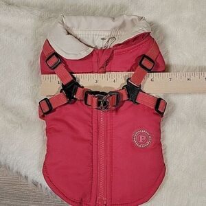 This pink winter doggie jacket zips up the back and has a built on harness. Perfect for keeping your faithful critter warm on those winter walks. See photos for measurements.