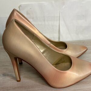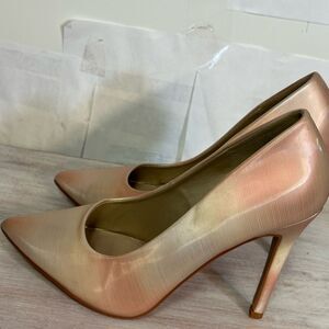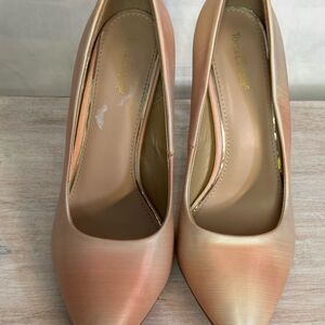 These elegant heels feature a sleek stiletto design and a captivating pink and gold metallic finish. The glossy sheen adds a touch of glamour, making them perfect for special occasions. With their classic silhouette, these heels offer both elegance and versatility.