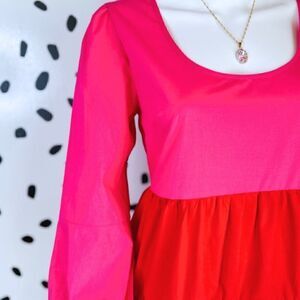 This sweet vibrant dress is sure to turn heads. Babydoll style in tiered colors of pink, red, and orange. Balloon sleeves with elastic cuffs, 100% cotton. Light weight and flirty. The perfect Valentine's Day dress. Boutique brand SugarLips is true to size.