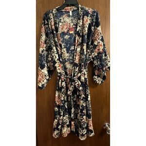 Elegant floral kimono with short sleeves. Navy base with cream and pink floral design. Perfect for layering.