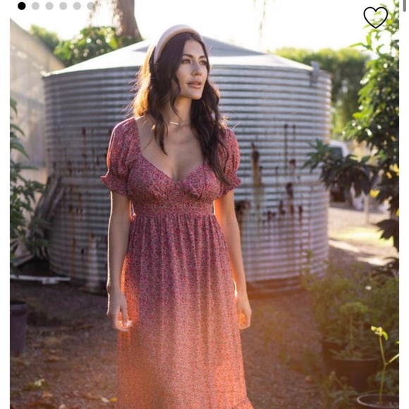 Elegant floral maxi dress. Features puff sleeves and a fitted waist. Perfect for any occasion.