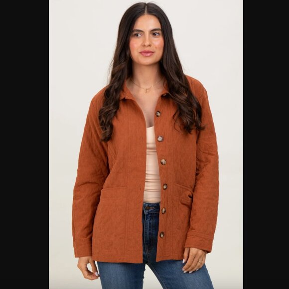 Pinkblush Forte Rust Quilted Button Jacket S NWT . Elevate your casual look with our Rust Quilted Button Jacket, perfect for layering in cooler weather. Featuring a rich rust hue and a stylish diamond quilted pattern, this jacket combines comfort with timeless style. The button-front closure adds a classic touch, while the two front patch pockets offer practicality and a laid-back vibe. Made from cozy, breathable fabric, it’s designed to keep you warm without sacrificing style. Whether paired with jeans for a weekend outing or layered over your favorite dress, this versatile jacket is a wardrobe essential for effortless everyday chic. Pit to pit 20.5", length 27"