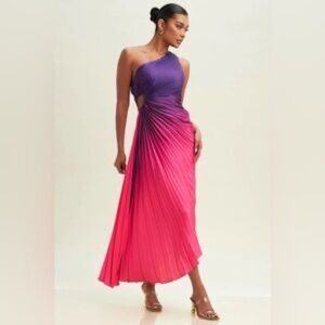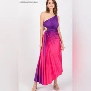 "An ombre, pleated maternity maxi dress with a one shoulder neckline, a side cutout, and an asymmetrical hem. Features a side zipper closure.