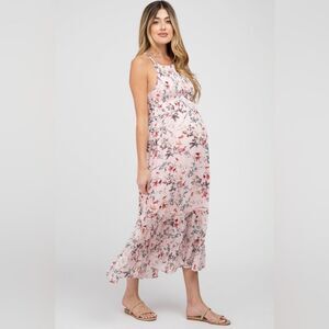 Pinkblush She + Sky Pink Floral Sleeveless High Neck Tiered Smocked Maxi Dress M