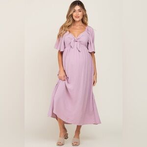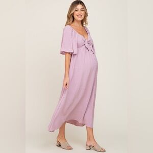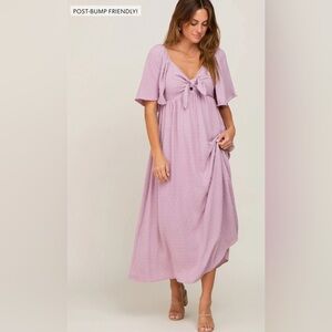 A textured dot maternity midi dress featuring a v-neckline with an adjustable front tie, a front cutout, short ruffle sleeves, a smocked elastic back, an empire waist and double lined. Ott by Pinkblush New without tags Inventory #R102