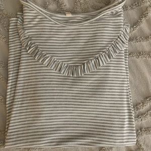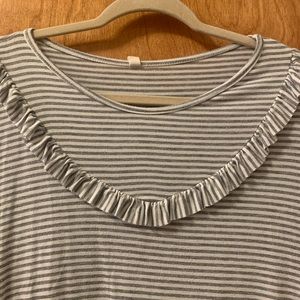 Cute grey and white striped top with ruffle detail. Super soft and stretchy!