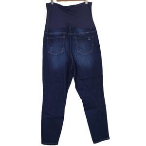 A pair of dark wash maternity plus size fitted jeans featuring distressed detailing, 5 pockets and an elastic belly band.