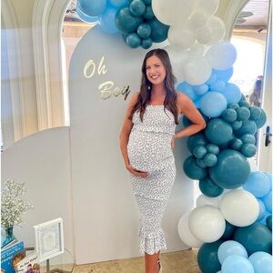 A floral print fitted maternity midi dress featuring a smocked body, a square neckline, adjustable cami straps and ruffled tiers.