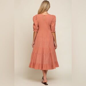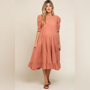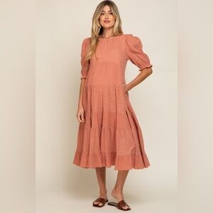 A maternity midi dress with a rounded neckline, short gathered puff sleeves, a back keyhole button closure, side pockets, and eyelet tiered silhouette. Dress is lined.