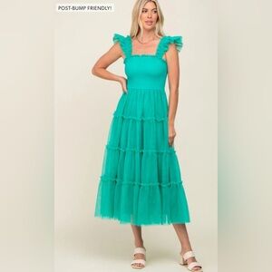 A solid maternity midi dress in a mesh material with ruffle accents. Features smocked bodice and tiered skirt.