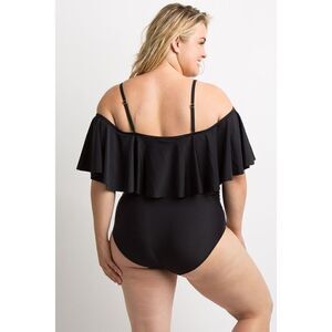 A solid ruffle trim one-piece plus maternity swimsuit. Padded cups on bust. Ruched sides. Double lined to prevent sheerness. Adjustable, convertible, and removable straps. All swimwear sold as separates.