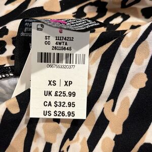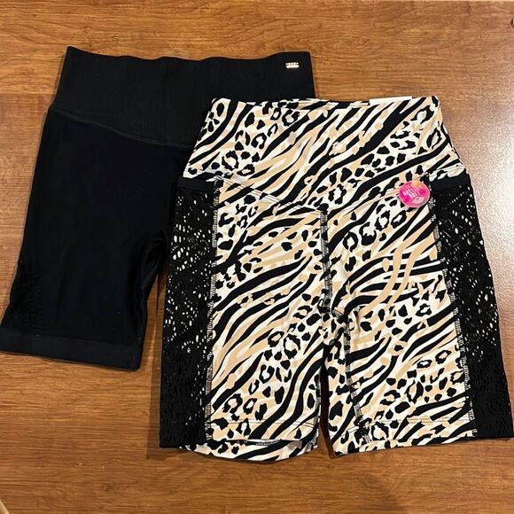 This bundle includes two new shorts with tags . One is a Leopard print with lace on the side. The other shorts are solid black with design on each side. Both are new in excellent condition.