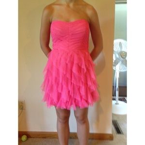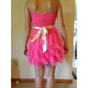 Pink/Coral strapless, short dress with removable tan/beige belt. Flowy bottom. Worn once. Size 7.