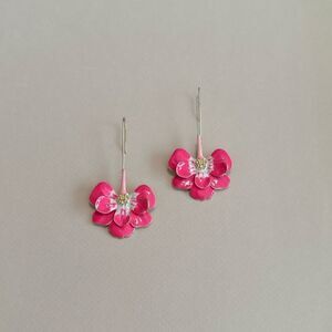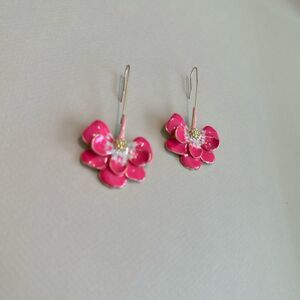Pink enamel flower drop dangle earrings in gold tone hardware