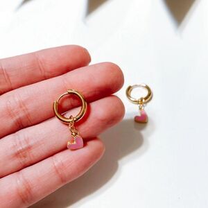 Pink enamel dangle heart hoop earrings in gold tone hardware