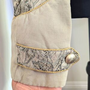 Description: Pinko Gold Floral Military Jacket 10 Maximalist Metallic Boho Preppy Rebel Punk, gorgeous gold button details with Pinko logo stamped on it, gold trim throughout, three button cinching on the back, shoulder straps, made in Italy