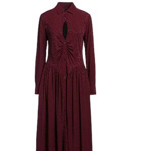 shirt dress, crepe, jacquard, gathered, solid color, classic collar, long sleeves, buttoned cuffs, unlined, button fastenings, pockets, machine wash or dry clean, do not bleach, do not tumble dry