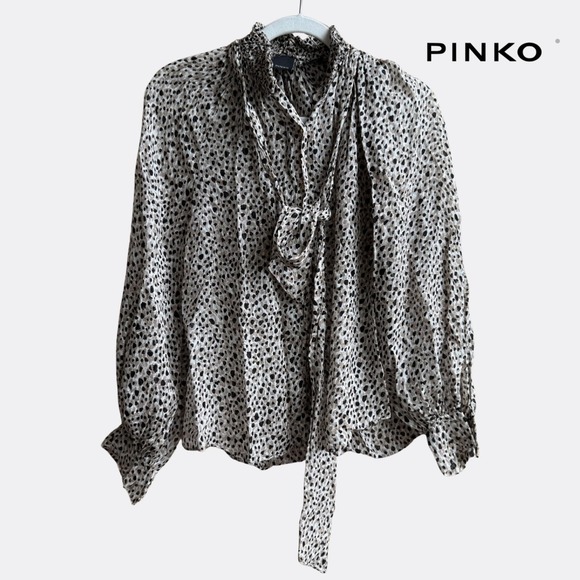 Chic and elegant leopard print blouse by Pinko, featuring a soft, lightweight feel and stylish neck tie detail. Perfect for both professional and casual outfits.