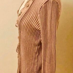 Features silver details between cardigan ribbing, intricate sequined embellishments and two ties in the front.