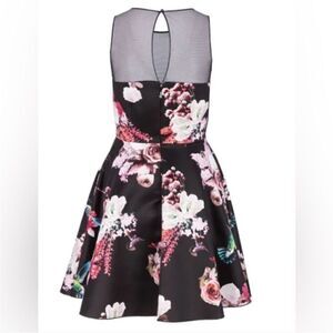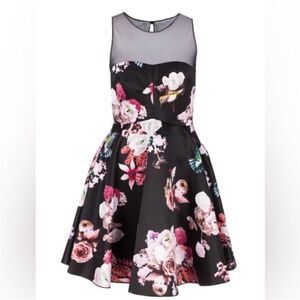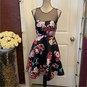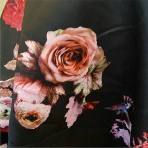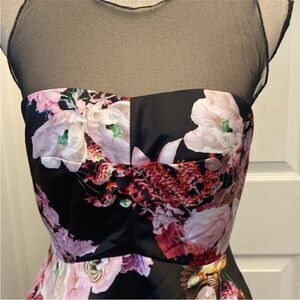 Elegant sleeveless dress with a floral pattern. Features a black base with pink and white flowers. New, no tags