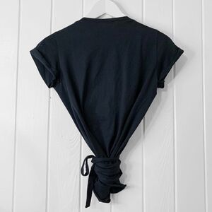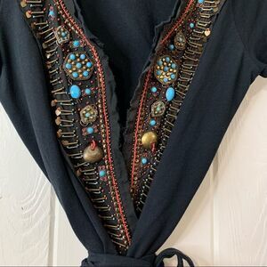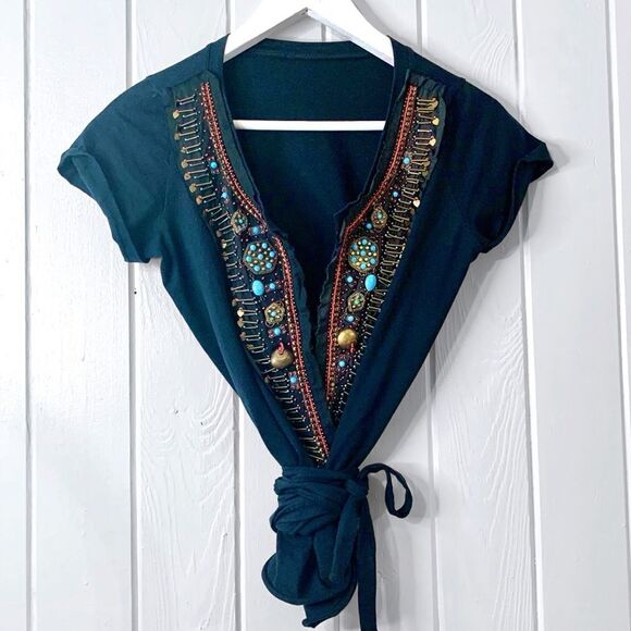 Black short sleeve wrap top decorated with gorgeous beading, metals, and turquoise colored stones. Single hook closure at bust area. 100% cotton. Made in Italy