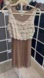 Elegant dress featuring a brown pleated skirt and cream lace top. Perfect for any occasion.