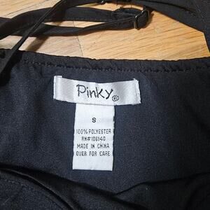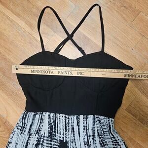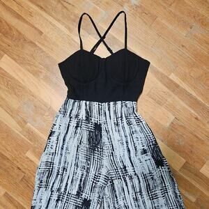 Stylish women’s jumpsuit by Pinky, size Small. This one-piece features a black sweetheart-style structured bodice with adjustable criss-cross straps and a zip-up closure. The bottom half has wide-leg flowy pants in a monochrome abstract print. Made from 100% polyester with a lined bust and soft drape. Perfect for summer events, festivals, or a modern night-out look. No flaws noted.