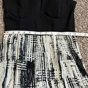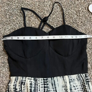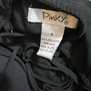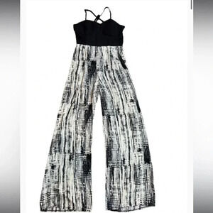 Pinky Jumpsuit black and cream white color wide leg light polyester. Height waist style Bra style spandex top spaghetti criss cross back. Adjustable straps. Waist zip closure. Light smudge on 1 area of top see last pic excellent condition otherwise measurements in pics