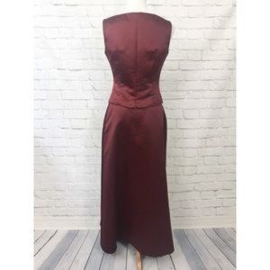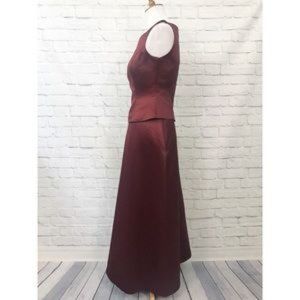 Excellent Condition Pinky & Me 2-piece Gown. Maroon Color. Fully lined, hidden zip closure on top and bottom. Perfect for any formal event. Tag size 6. Approximate measurements laying flat: bust 17.5”, length shoulder to hem of top 19”, waist 14”, outseam of Skirt 38”. Bundle and Save!