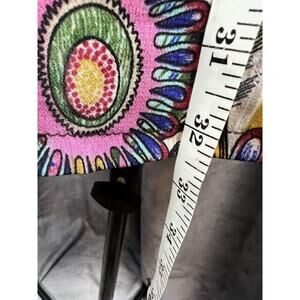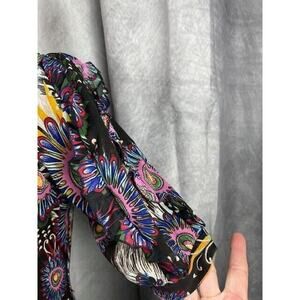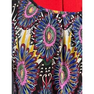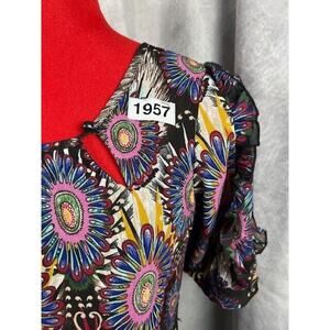 This is a Pinky brand summer dress in size Small, featuring a high neckline, puff sleeves with ruffle accents, a fit & flare style, and an elasticated waist. The dress is made of polyester chiffon material with a geometric multicolored pattern, suitable for occasions like travel, weddings, or casual wear with a beach theme.