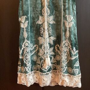 Elegant green dress with intricate cream lace detailing. Perfect for special occasions.very good condition