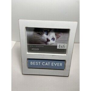 Showcase your beloved feline friend in style with the Pinnacle Cat Photo Frame. Designed specifically for 4 x 6 inch photos, this contemporary white wooden frame features a charming cat/kitten theme that's perfect for any cat owner. The frame is equipped with a rear-loading mechanism, making it easy to insert and display your favorite cat picture. Measuring at 8 inches in height, 7 inches in width, and 0.75 inches in length, this frame is ideal for creating a focal point on your desk, bookshelf, or nightstand. Its square shape and 4-inch interior height ensure your photo is displayed in a pleasing landscape orientation. With its free-standing design and simple box frame depth of 0.5 inches, this frame adds a touch of whimsy and warmth to any room. Used in like new condition ( by photo frame)