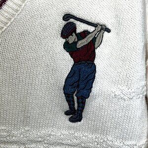 This vintage sweater tells a story of sophistication and style on the golf course. With its intricate 3D embroidery depicting a classic golfer, it's a nod to the elegance of the sport. Crafted for comfort and designed to stand out, it embodies a timeless charm.