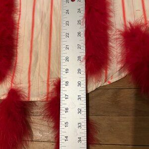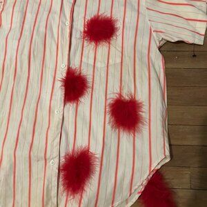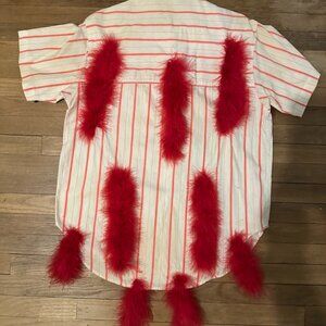 Used has some yellow stains. This rare shirt has red feather-like tails on the back for the shirt ( Please see pictures)