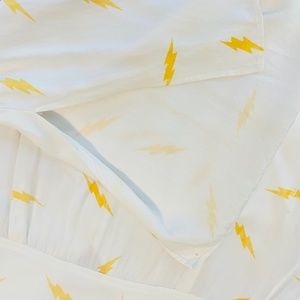 It’s a size small but is very flowy and could pass as a medium-large, the print has many yellow lightning bolts along the body, as well as having small slits in the sides (pictured above)