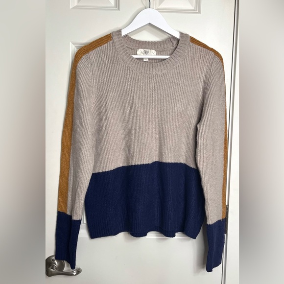 Stay cozy and stylish with this colorblock sweater. Featuring a chic combination of gold, navy, and tan, this sweater is perfect for any casual outing. Its soft fabric ensures comfort all day long.