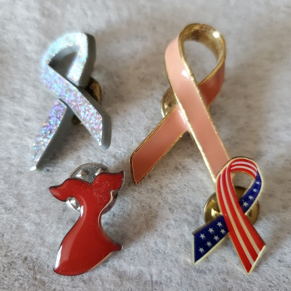 4 piece Pins, pink, silver ribbons, red dress and flag