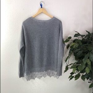 A pins and needles grey sweater with a white lace detail bottom. Slits on each side. Cozy, yet beautiful.